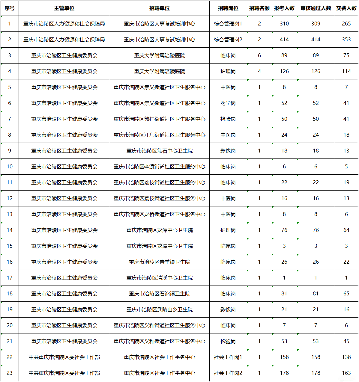 2025一季度重慶區縣事業單位招聘最終報名人數統計(涪陵區)