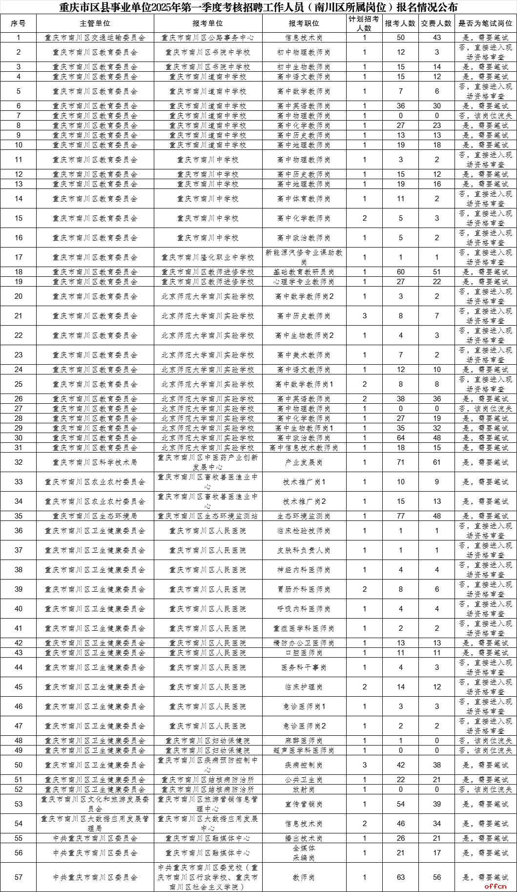 2025一季度重慶區縣事業單位招聘最終報名統計(南川區考核)