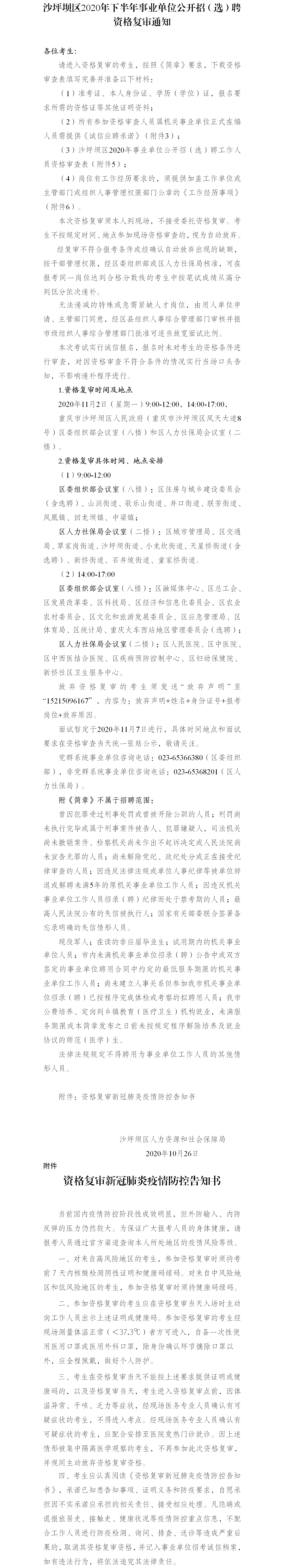 沙坪壩區2020年下半年事業單位公開招(選)聘資格復審通知