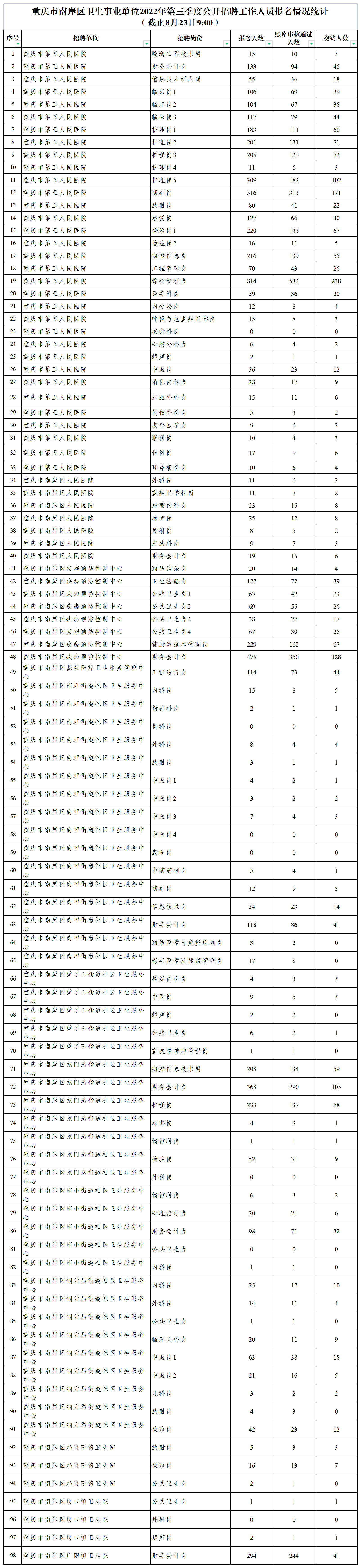 原標題:重慶市南岸區衛生事業單位2022年第三季度公開招聘工作人員報名情況統計(8月23日)