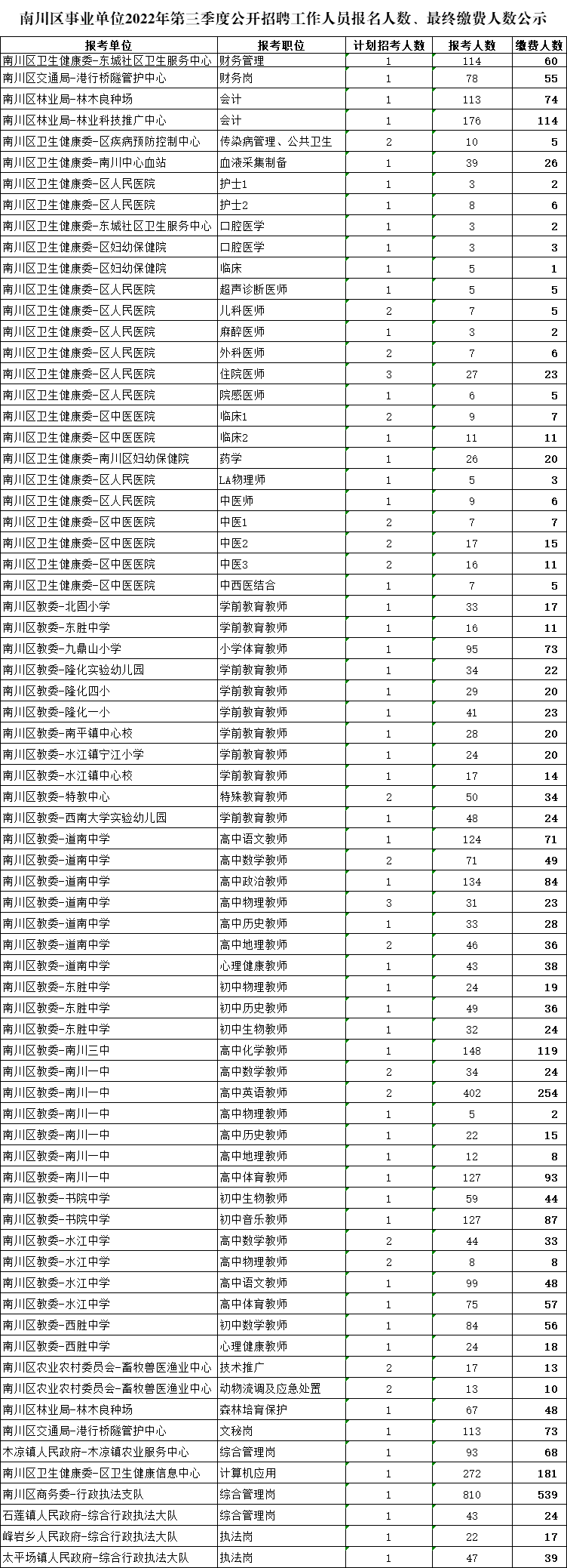 原標題:南川區事業單位2022年第三季度公開招聘工作人員報名人數、最終繳費人數公示