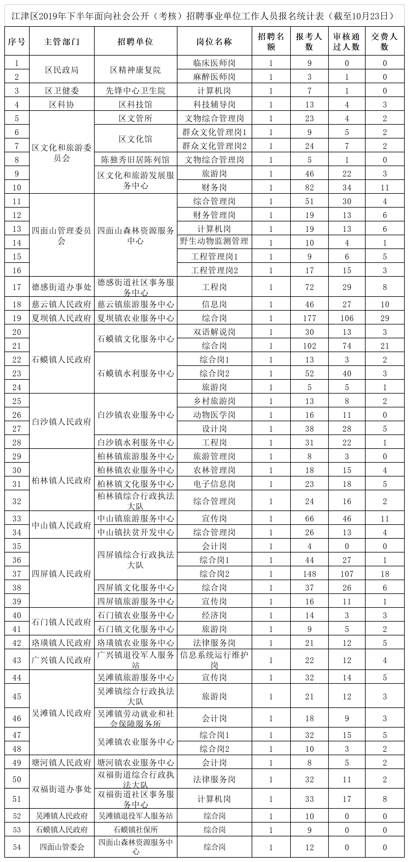 江津區2019年下半年面向社會公開(考核)招聘事業單位工作人員報名統計(截至10月23日)