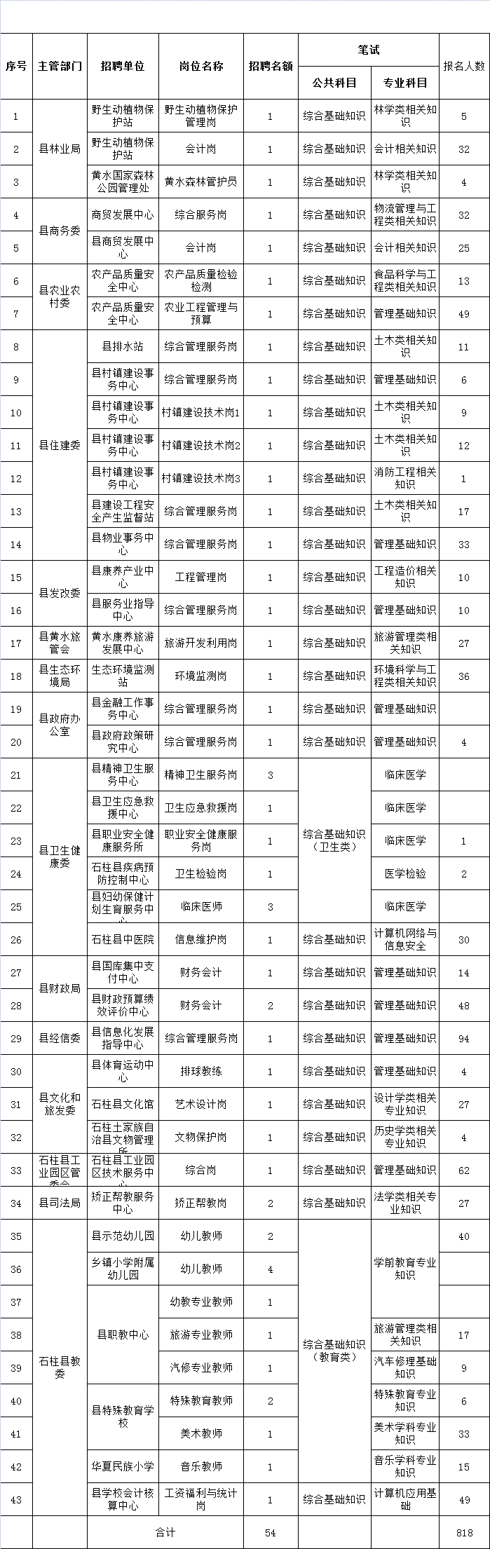 石柱縣2019年下半年公開招聘事業單位工作人員各崗位報名人數公示表