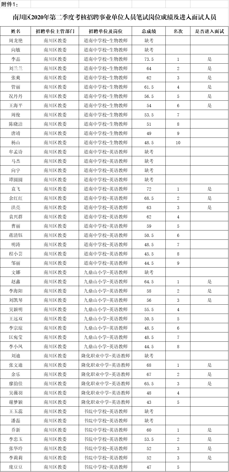 根據《南川區2020年二季度考核招聘事業單位工作人員簡章》規定,現將筆試成績、進入面試環節人員名單及資格復審相關安排事項告知如下,請應試人員按照本須知規定參加各環節。