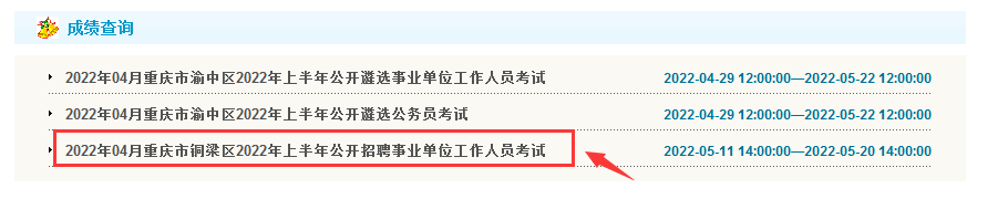 2022年上半年銅梁區(qū)事業(yè)單位公開招聘考試成績查詢?nèi)肟?br /> 點擊進入↓↓↓