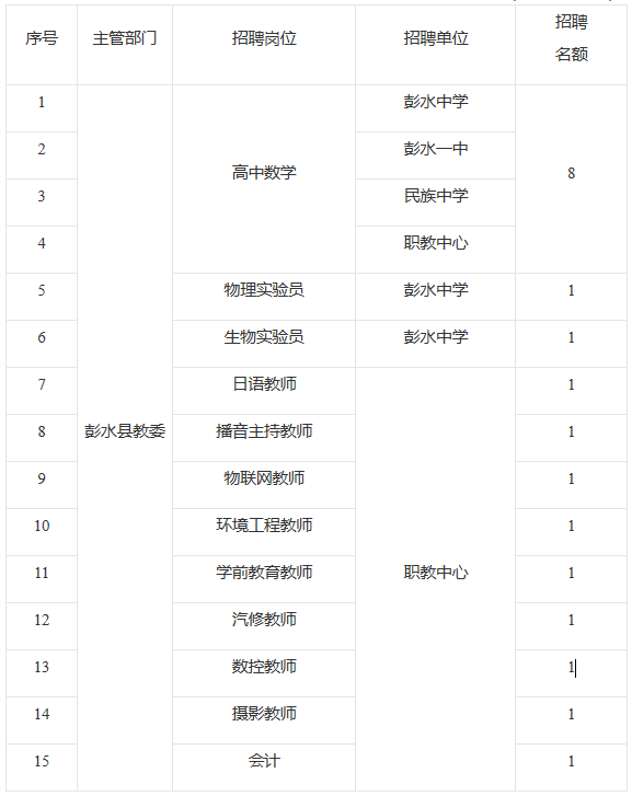 原標(biāo)題:彭水縣2020年下半年公開招聘事業(yè)單位工作人員(第二批次)招聘崗位公布
