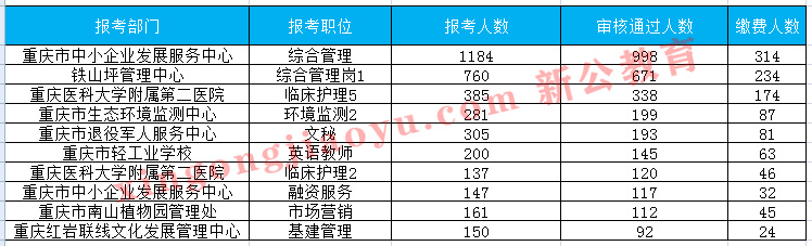 過審前十的崗位中有七個崗位報名人數(shù)排在前十,排在前兩位的均超過500人過審。重慶市中小企業(yè)發(fā)展服務(wù)中心-綜合管理崗位是目前過審人數(shù)最多的崗位,同時也是報名人數(shù)最多的崗位,此崗位僅招考一人,但國民教育本科以上學歷即可報,且不限專業(yè),無政治面貌要求,年齡限制在35周歲以下,因此成為火爆職位。鐵山坪管理中心-綜合管理崗位1要求全日制本科及以上學位,同時還要求報考人員為黨員(含預備黨員),但此崗位不限專業(yè),屬于市紀委,招考6人,因此報考人數(shù)較多。