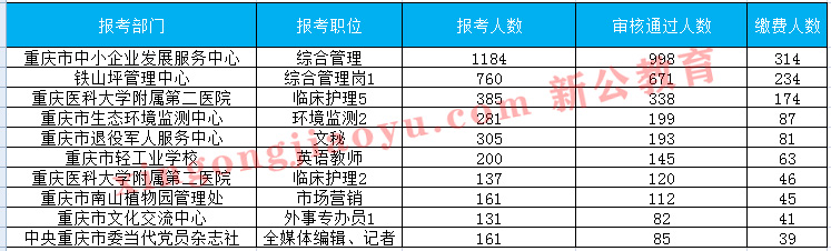重慶事業單位考試網為大家整理了本次考試繳費人數最多的前十崗位。目前排在第一的是重慶市中小企業發展服務中心的綜合管理崗,已有314人交費,但是此崗位僅招考一人,因此競爭壓力較大。報名時間已經進入高峰期了,之前還在觀望的考生也開始陸陸續續報名,但可以看到的是,很多同學雖然已經報名,也通過了審核,但是并沒有交費,從第94個崗位開始,交費人數便為個位數了。小編在此溫馨提示,交費成功才算報名成功,已經過審的考生盡快交費,完成報名。