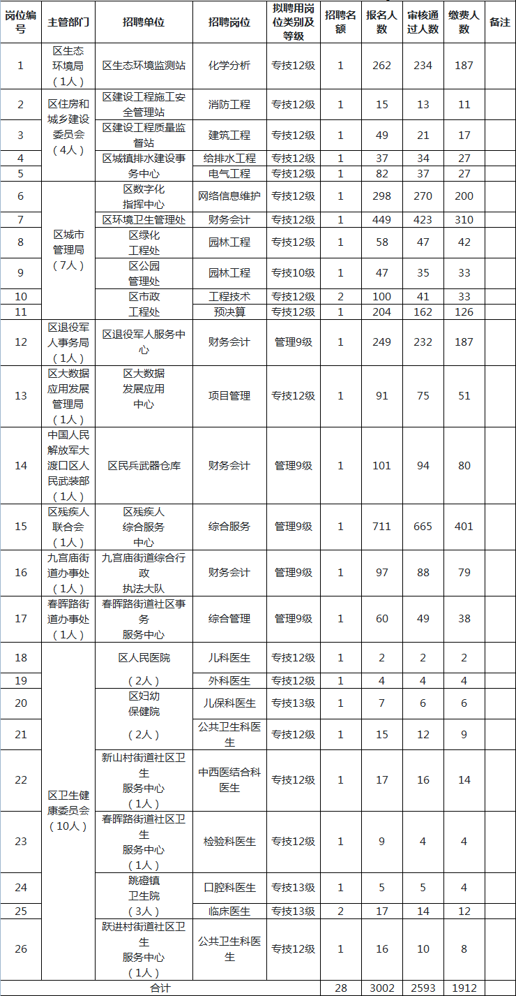 大渡口區2019年下半年面向社會公開招聘事業單位工作人員報名情況一覽表