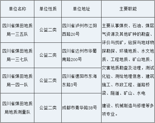 根據《事業單位人事管理條例》、《事業單位公開招聘人員暫行規定》和《四川省省屬事業單位公開招聘工作人員實施細則(試行)》等有關規定,四川省煤田地質局擬面向社會公開招聘部分工作人員補充到一三五隊等4個直屬事業單位工作。現將公開招聘有關事項公告如下(本公告由四川省煤田地質局)同時在四川省人力資源和社會保障廳官網[rst.sc.gov.cn,下同]“人事考試”專欄和四川省煤田地質局網 [http://mtdzj.sc.gov.cn,下同]上發布。