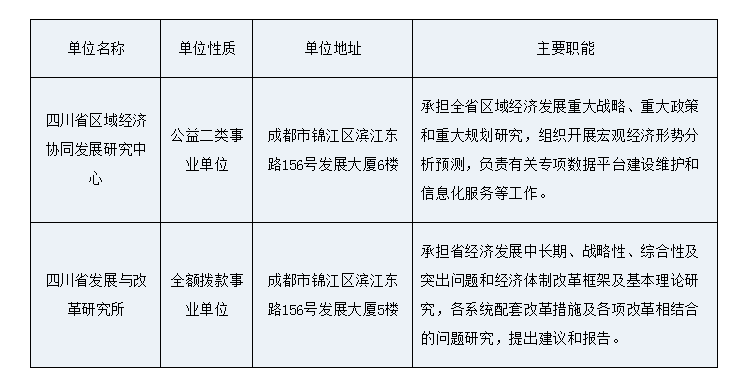 本次招聘均在事業單位經批準設置的崗位內招聘,招聘名額為8名,其中四川省區域經濟協同發展研究中心6名、四川省發展與改革研究所2名,具體崗位見《崗位和條件要求一覽表》。
