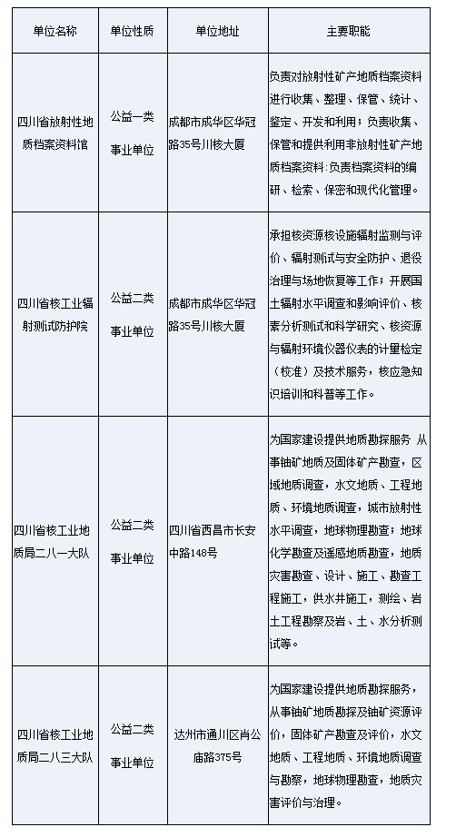 根據《事業單位人事管理條例》、《事業單位公開招聘人員暫行規定》和《四川省省屬事業單位公開招聘工作人員實施細則(試行)》等有關規定,四川省核工業地質局擬面向社會公開招聘部分工作人員補充到四川省放射性地質檔案資料館、四川省核工業輻射測試防護院、四川省核工業地質局二八一大隊、四川省核工業地質局二八三大隊等4個直屬事業單位工作。現將公開招聘有關事項公告如下(本公告由四川省核工業地質局同時在四川省人力資源和社會保障廳官網[rst.sc.gov.cn,下同]“人事考試”專欄和省核工業地質局官網[schgy.sc.gov.cn,下同],省核工業輻射測試防護院官網[www.chfc.com.cn,下同])、省核工業地質局二八一大隊官網[www.schgy281.com,下同]、省核工業地質局二八三大隊官網[http://www.ch283.cn/,下同])上發布。