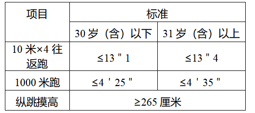 男子1000米跑、女子800米跑兩個項目的測評次數為1次,10米×4往返跑的測評次數不超過2次,縱跳摸高的測評次數不超過3次。