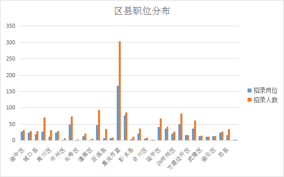 今年,重慶公務員招錄崗位涉及32個區縣,巴南、南岸、江北、九龍坡區、墊江、大足、榮昌及兩江新區皆沒有單獨招聘的崗位,但市直崗位有部分分布在這些區縣。2019年重慶市直崗位招錄崗位168個,總招錄人數304人,占總招錄人數的22.9%。