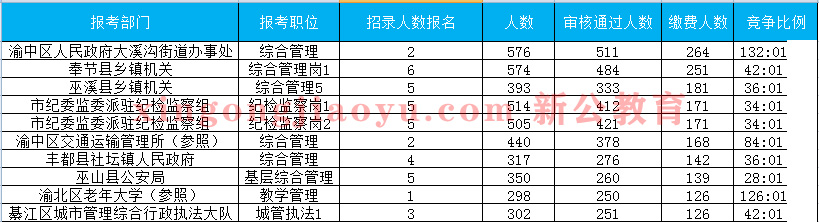相信現在還有不少考生肯定還在觀望吧?希望大家觀望的時間不要太長,還是抓緊時間報名。畢竟到最后一天可能會出現服務器擁堵的情況。重慶新公教育給大家整理匯總了重慶人事 考試網發布的27日交費前十職位!供大家參考。