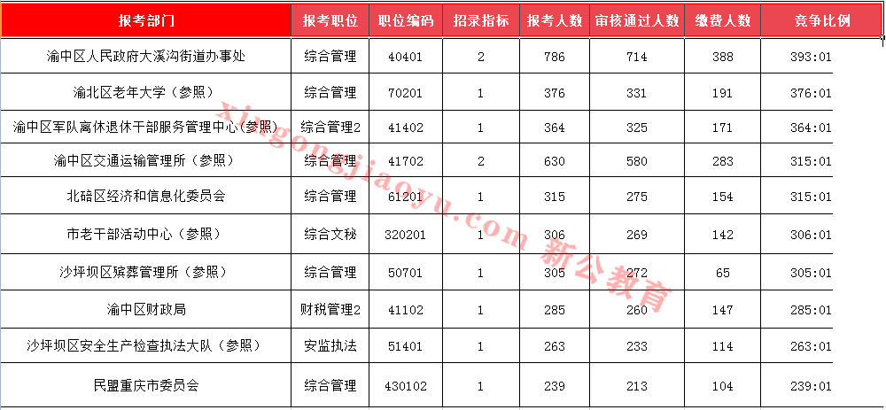 今天是重慶公務(wù)員報(bào)名第五天,報(bào)名人數(shù)明顯上升,較昨日新增19749人,這五天來競爭最激烈職位都在渝北區(qū)老年大學(xué)和渝中區(qū)人民政府大溪溝街道辦事處這兩個(gè)部門職位變換,競爭比例很是接近,可見考生對著兩個(gè)職位的青睞,也說明很多考生都符合該職位要求。在今天新出的競爭激烈前十的職位中,沙坪壩安全生產(chǎn)監(jiān)察執(zhí)法大隊(duì)的安監(jiān)執(zhí)法一職后來居上,成功擠入前十,但渝中區(qū)軍隊(duì)離休退休干部服務(wù)管理中心(參照)綜合管理依然穩(wěn)排第三,競爭比例增至364:1,相比昨日競爭比例整整提升了100!中公小編提醒廣大考生,認(rèn)真填寫報(bào)考信息,理性選擇適合自己的崗位報(bào)考,在此預(yù)祝大家成功!