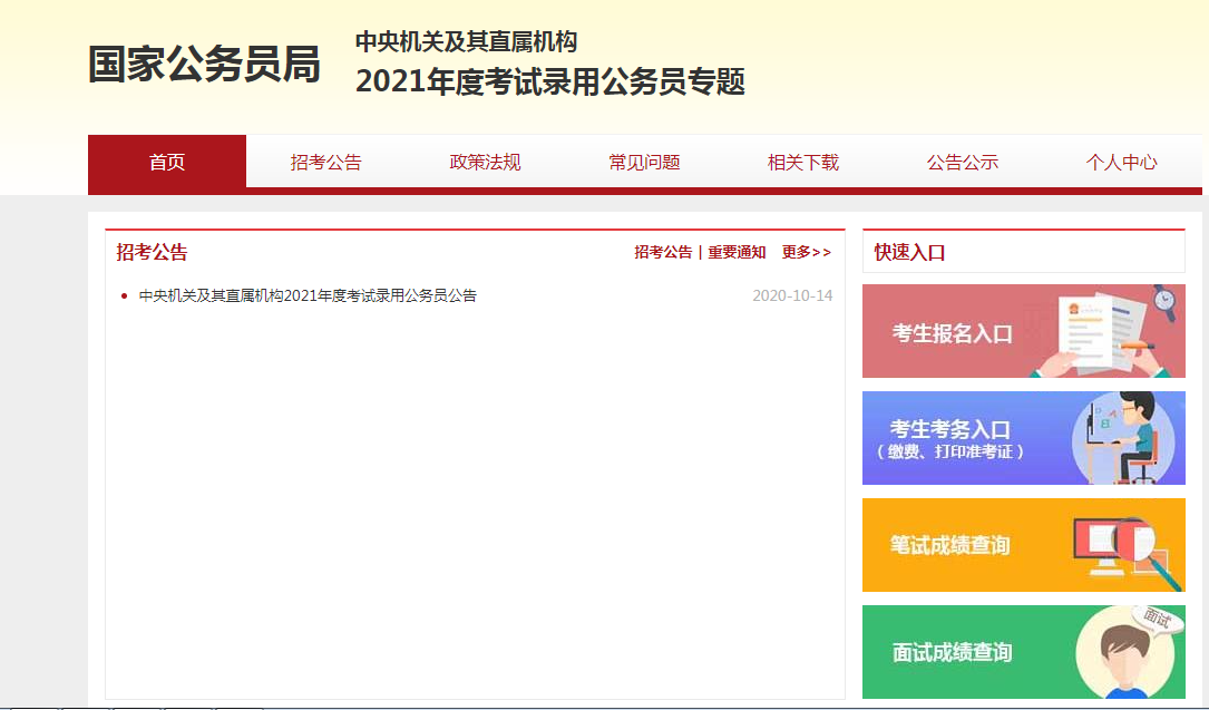 【導(dǎo)語】2021年國家公務(wù)員考試報名入口現(xiàn)已發(fā)布,新公教育 為廣大考生整理此次公告內(nèi)容如下,望各位考生及時查看切勿錯過報名時間。新公教 育為報考重慶事業(yè)單位考生提供備考資料、輔導(dǎo)用書、真題講義、筆試課程等內(nèi)容, 歡迎各位考生加入備考QQ群 931762566一起學(xué)習(xí)!