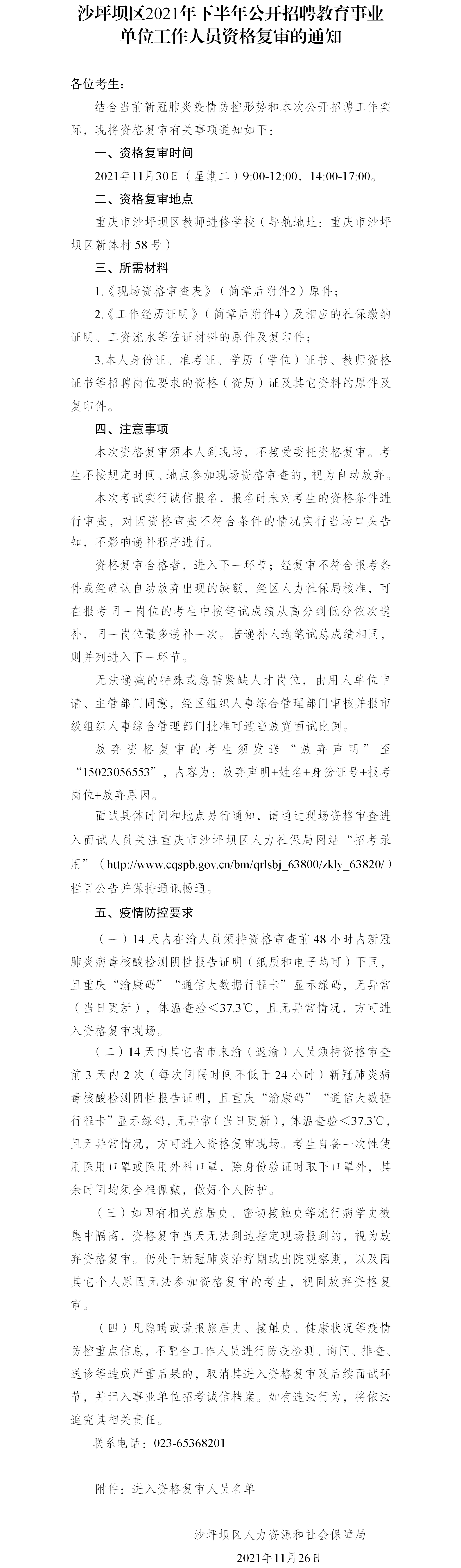 原標(biāo)題:沙坪壩區(qū)2021年下半年公開(kāi)招聘教育事業(yè)單位工作人員資格復(fù)審的通知