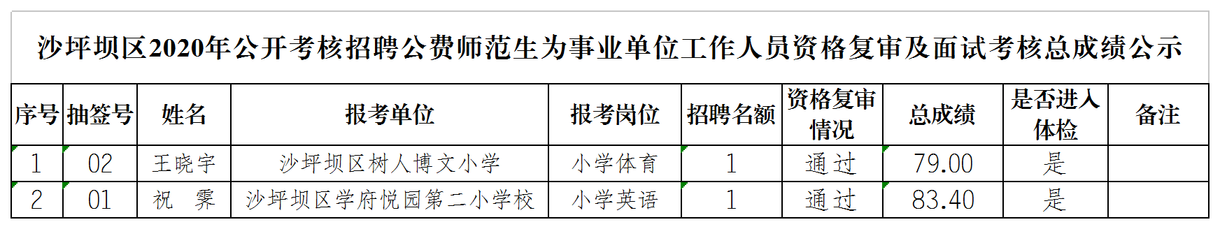 【導語】2020年沙坪壩區事業單位招聘資格復審及面試成績公布現已發布,新公教育 為廣大考生整理此次公告內容如下,望各位考生及時查看切勿錯過報名時間。新公教 育為報考重慶事業單位考生提供備考資料、輔導用書、真題講義、筆試課程等內容, 歡迎各位考生加入備考QQ群 663261430一起學習!