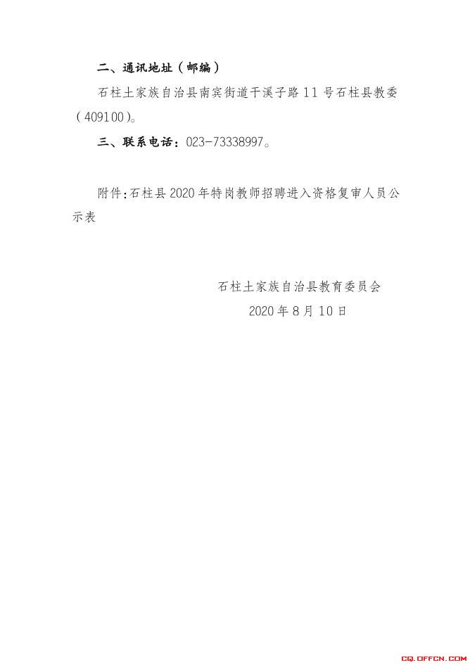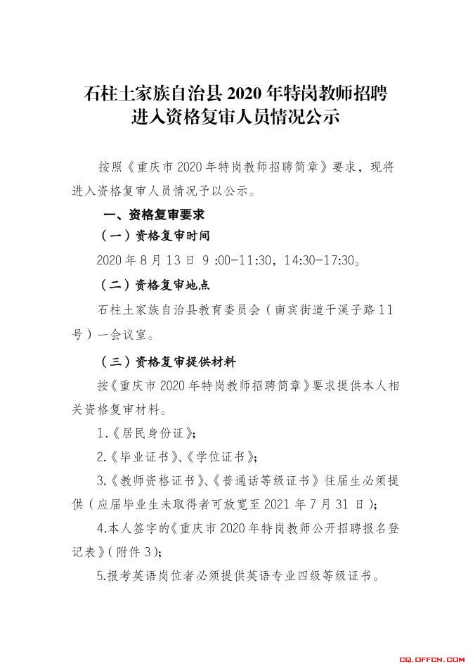 點擊下載>>>2020重慶石柱特崗教師招聘資格復審名單