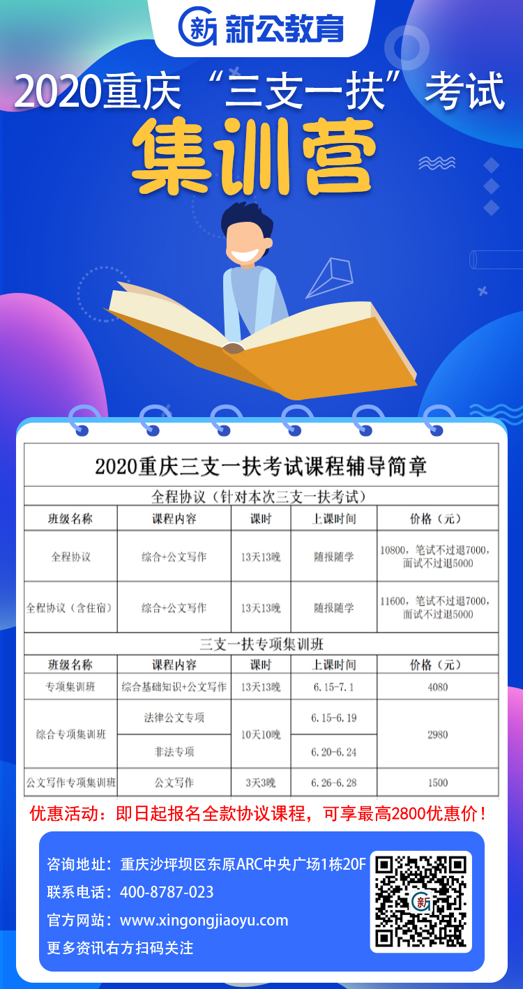 【導語】2020重慶三支一扶招錄547人公告現已發布,新公教育 為廣大考生準備了此次考試的輔導課程,望各位考生及時備考爭取早日上岸。新公教 育為報考重慶事業單位考生提供備考資料、輔導用書、真題講義、筆試課程等內容, 歡迎各位考生加入備考QQ群 951111480一起學習!