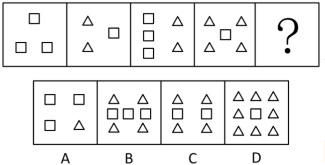 元素代換題目的背后其實(shí)是一組等差數(shù)列,例如上題是3、5、7、9,因此我們可以通過(guò)等差數(shù)列的性質(zhì)來(lái)解題,等差數(shù)列中a1+a3=2(a2),運(yùn)用到圖形推理中即為:前圖形+后圖形=2倍中間圖形,上題我們就可以以圖1+圖3=2倍圖2來(lái)解題,即(3正方形)+(3正方形+2三角)=2(1正方形+2三角形),化簡(jiǎn)得到6正方形+2三角形=2正方形+4三角形,最后得到1三角形=2正方形。得到代換關(guān)系后,代入題干即可。