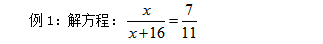 等式左邊有未知數(shù)x的上下的比例關(guān)系,右邊是7和11的比值,那么7和11如果當作比例來看的話,比例可以當作份數(shù)思想來看,也就是7份和11份,x對應的就是7份,x+16對應的就是11份,而左邊x和x+16相差了16的具體數(shù)值,右邊差了4份,那么4份就對應16的具體值,1份就對應4的數(shù)值,x在其中對應的是7份,也就是28,這樣x的值也就求解出來了。通過比例的思想,我們可以省去了解方程的過程,因此這樣的方法還是很好用的,那么大家是否能夠靈活運用我們的比例關(guān)系求解呢?來再看下一道題目。